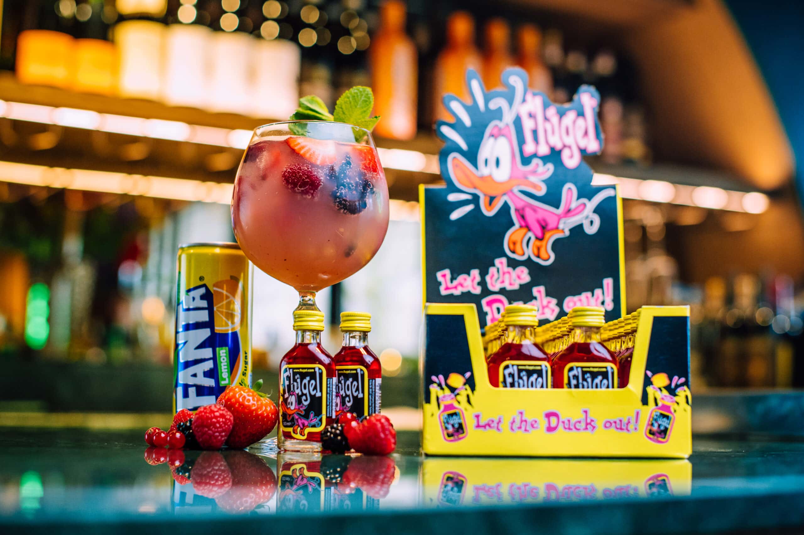Vul het glas met ijsblokjes en schenk hier 1Flügel bij. Doe vervolgens het rode fruit erin en schenk het glas vol met sinas lemon. Garneer als laatste de mix met een citroenschijfje en een takje munt. Proost!